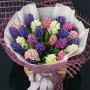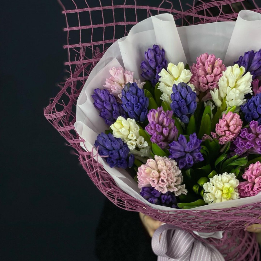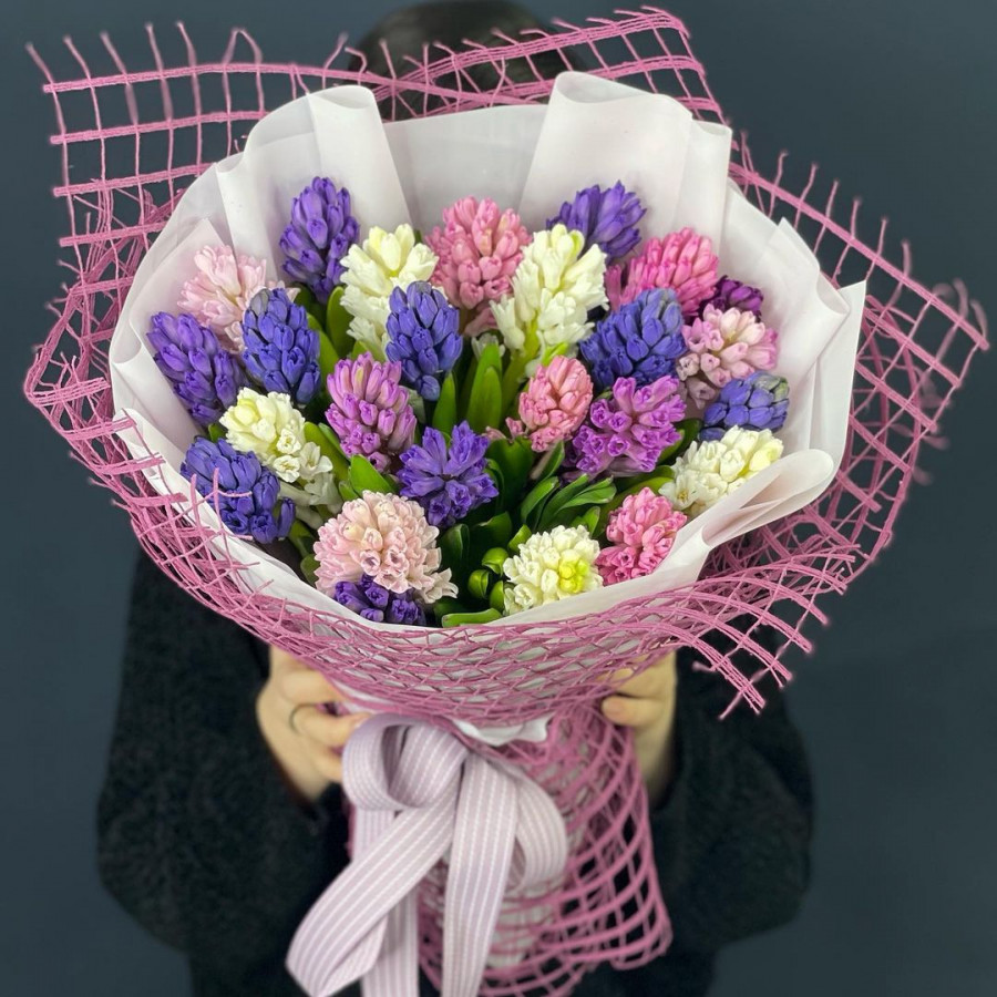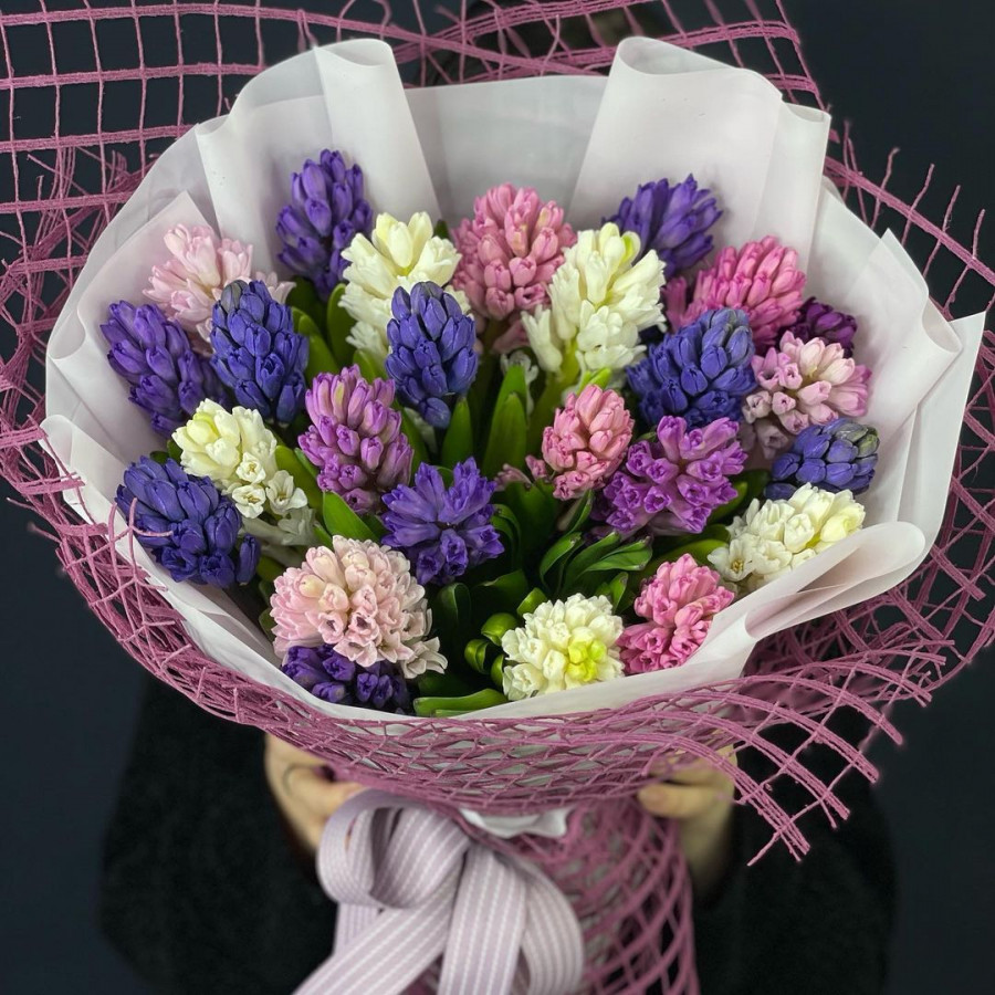 На фото букет из 27 разноцветных гиацинтов. В составе: гиацинт 27 шт, фетр 1 шт, атласная лента 1 шт, . Все цветы свежие и ароматные, букет красиво оформлен и отлично подходит для подарка. Доступна доставка цветов или самовывоз.